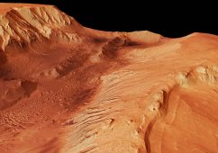 На снимке, сделанном орбитальным аппаратом ExoMars Trace Gas Orbiter, запечатлен марсианский кратер шириной 4 км в районе Великой Северной равнины. Он частично заполнен водяным льдом, особенно на северных склонах, которые хуже освещаются в течение года. Темная полоса на краю кратера состоит из вулканических материалов, таких как базальт.