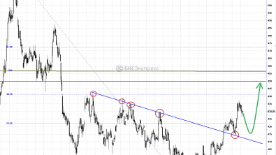 В то же время в апрельской динамике можно разглядеть и сформированную фигуру «Голова-плечи» с линией шеи в районе 428. Она уже пробита и протестирована снизу. Ее потенциал достигает уровней 405-406.
