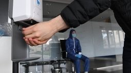 Рабочий пользуется антисептиком перед началом смены на заводе «Метровагонмаш» в подмосковных Мытищах