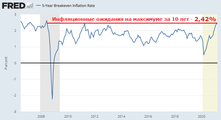 Инфляционные ожидания, отраженные в разнице между доходностью казначейских 5-летних облигаций и доходностью по 5-летним TIPs (гособлигации с защитой от инфляции), сейчас на максимуме за 10 лет. В моменте на прошлой неделе показатель выходил и к уровням 2008 г. Вчера доходность 10-летних трежерис превысила 1,6%, удерживаясь на годовых максимумах.