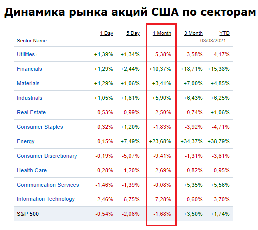 Первые очевидные признаки ротации, перераспределения капитала появились осенью, когда стали появляться новости об успехе испытаний вакцин. За последний месяц можно уже по секторам наблюдать снижение в акциях IT-сектора (-7,3%), потребительских товаров (-9,4%) и подъем в финансовом (+10,4%), энергетическом (+23,7%), промышленном (+5,9%).