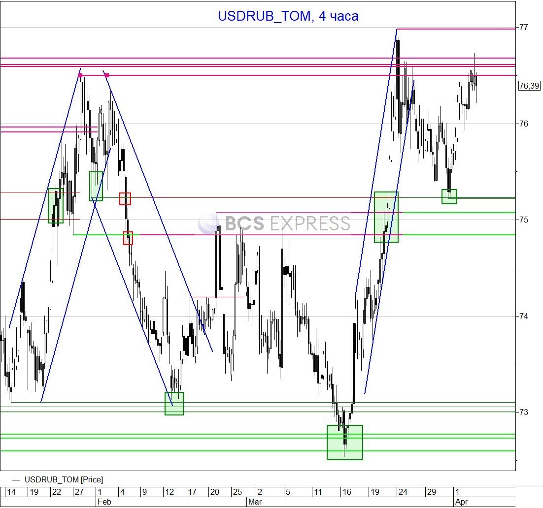 Пара USD/RUB утром предприняла еще одну попытку преодолеть область сопротивления 76,5–76,7. Хотя в моменте котировки превышали ее верхнюю границу, затем произошел откат и выход вниз из данной области. Тем не менее до обновления пятничного минимума 75,92 более вероятна по меньшей мере еще одна атака на уровень 77 руб.