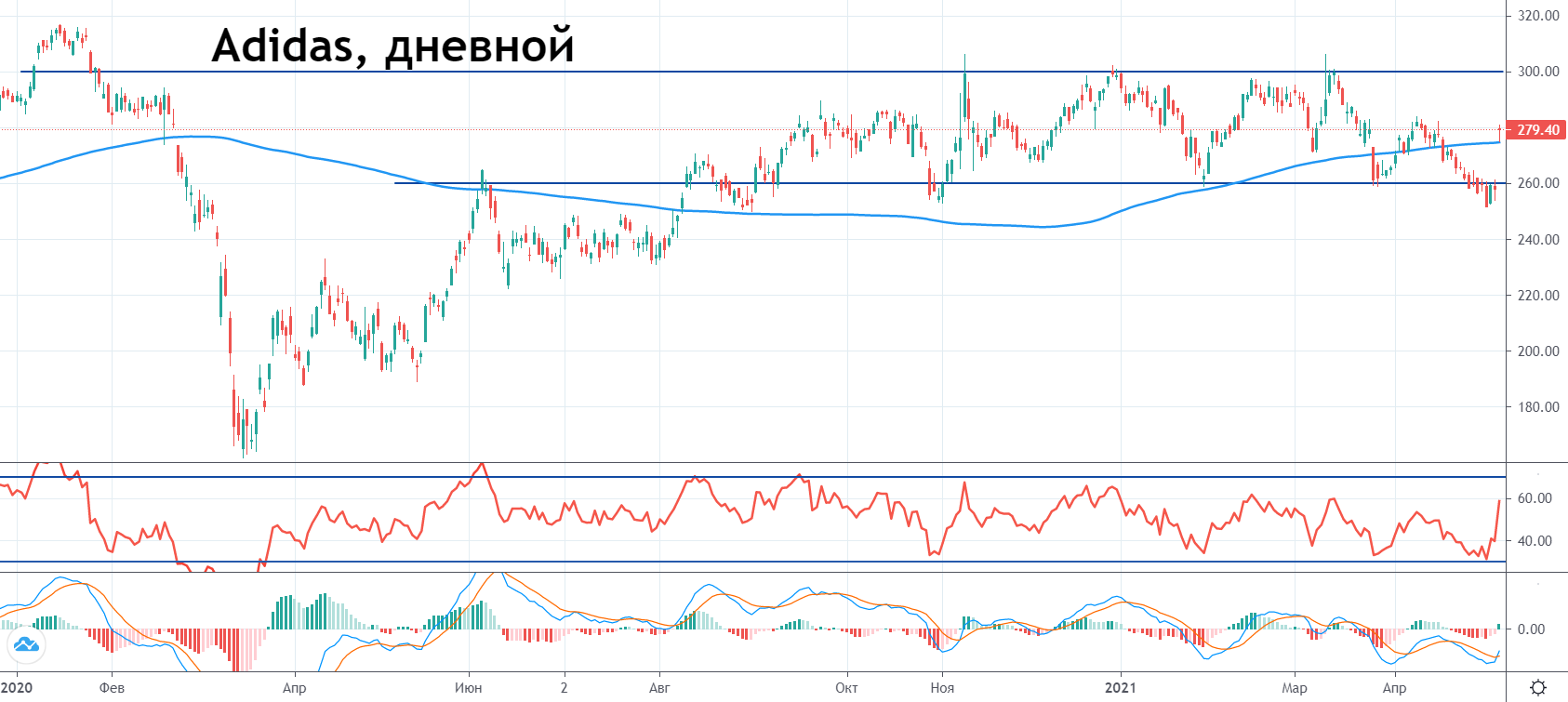 Котировки Adidas еще не восстановились после снижения в начале 2020 г. Сегодняшний подъем способствовал закреплению цены выше 200-дневной скользящей средней. Если в краткосрочной перспективе растущий тренд сохранится, то цена вскоре может добраться до 300 евро. Эту отметку котировки не могли преодолеть с ноября 2020 г., когда они перешли в боковую консолидацию диапазона 260–300 евро.