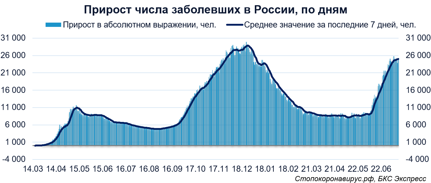 Число заразившихся коронавирусом в России на 15 июля увеличилось на 25 293 чел. за последние сутки, до 5 882,2 тыс., сообщается на сайте стопкоронавирус.рф. Прирост числа заболевших по итогам последних суток ускорился относительно уровня предыдущего дня (было +23 827).