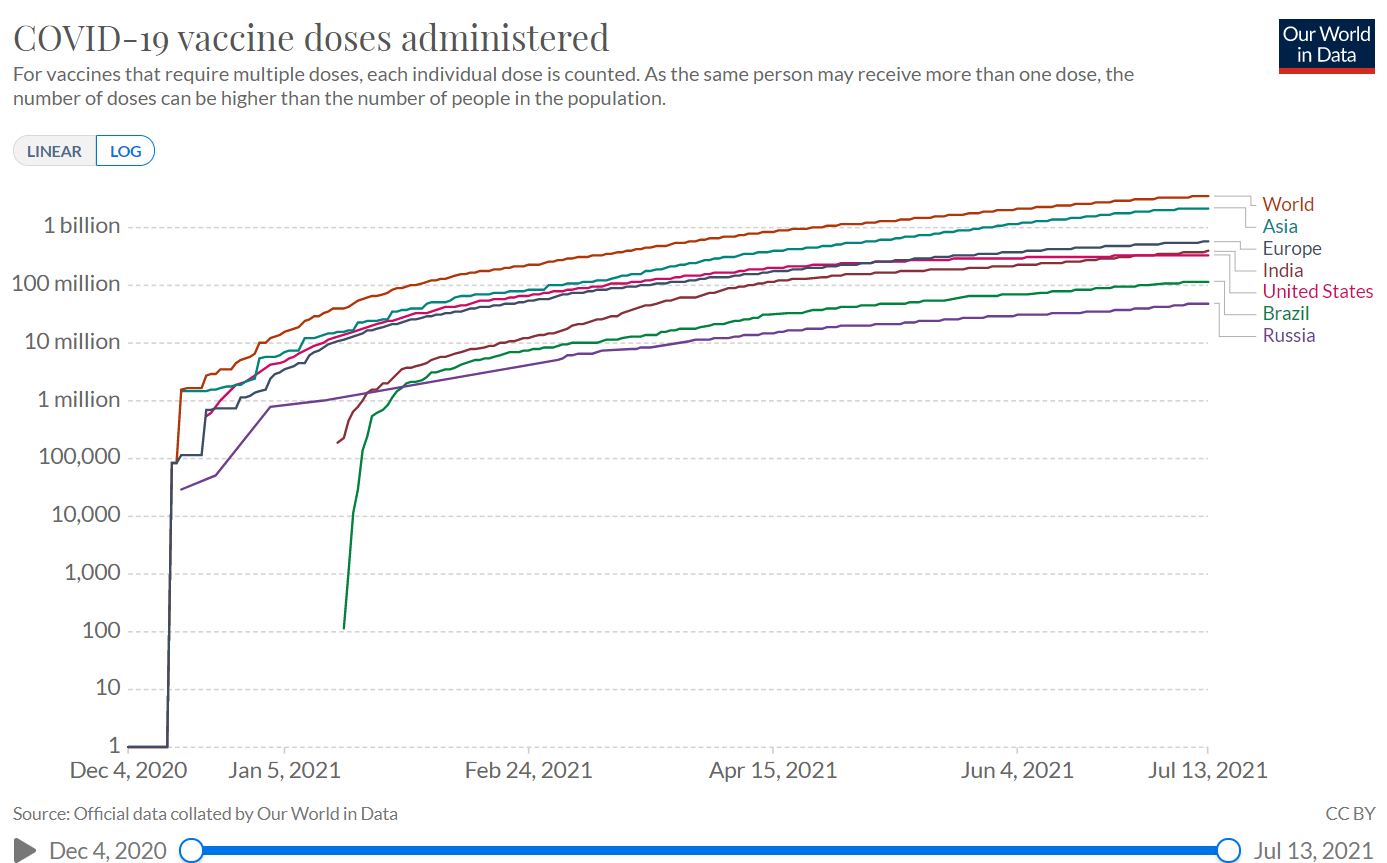 По данным сайта Our World in Data, на 13 июля количество вакцинаций COVID-19 составило более 3,51 млрд.