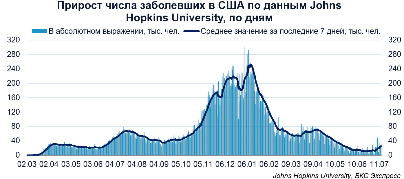 По данным Johns Hopkins University, число подтвержденных случаев коронавируса в США на 14 июля составило 33,94 млн чел., увеличившись на 31,8 тыс. Прирост замедлился в сравнении с 26,4 тыс. новыми случаями днем ранее.